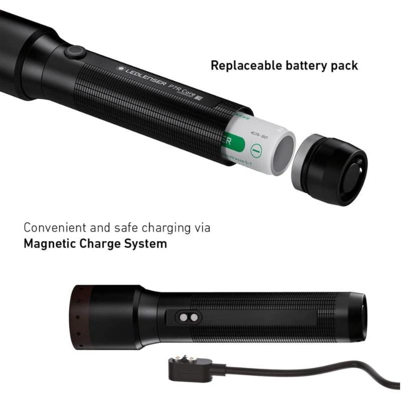 The P7R Core's sleek design encases a powerful light and cutting-edge technology that provides incredibly bright views. It is customisable with the innovative Smart Light Technology and can be charged with the Magnetic Charge System. The Advanced Focus System combined with the new Multi-Core Optics Technology offers a consistent light beam in spot or flood mode and, if necessary, even under water. And if you want to keep your hands free and illuminate a room, the lamp can easily be placed on the end cap.