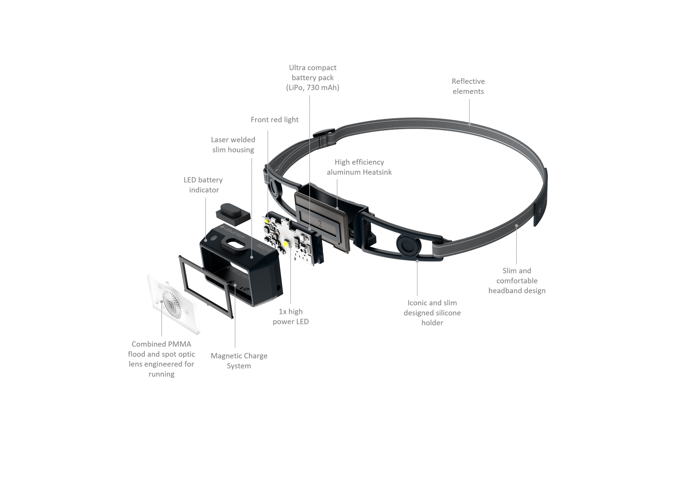 The NEO1R is an ultra-compact head light that fits in any pocket and is ready to become the perfect outdoor running companion when you are ready to go after the sun sets or before it rises. The lumens per gram ratio and custom made light pattern for fast paced activities makes this more than a backup head torch. The tilting lamp head, available front red light and rechargeable battery is all packed into this extremely lightweight 39g head lamp.