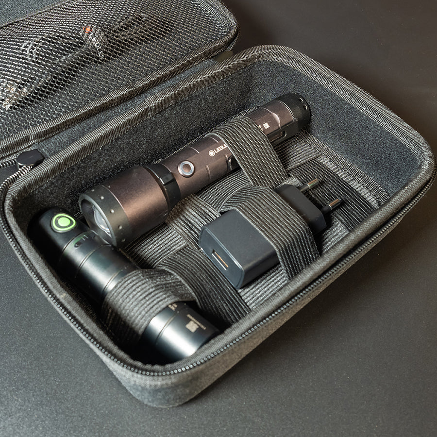 With this high-quality, textile-covered hard-shell case, your Ledlenser Torch or Head Torch and accessories are always safely and elegantly stored as well as protected from dust and other external influences. Inside, it offers elastic loops and a mesh pocket to store the torch, power bank, cables and other accessories.
