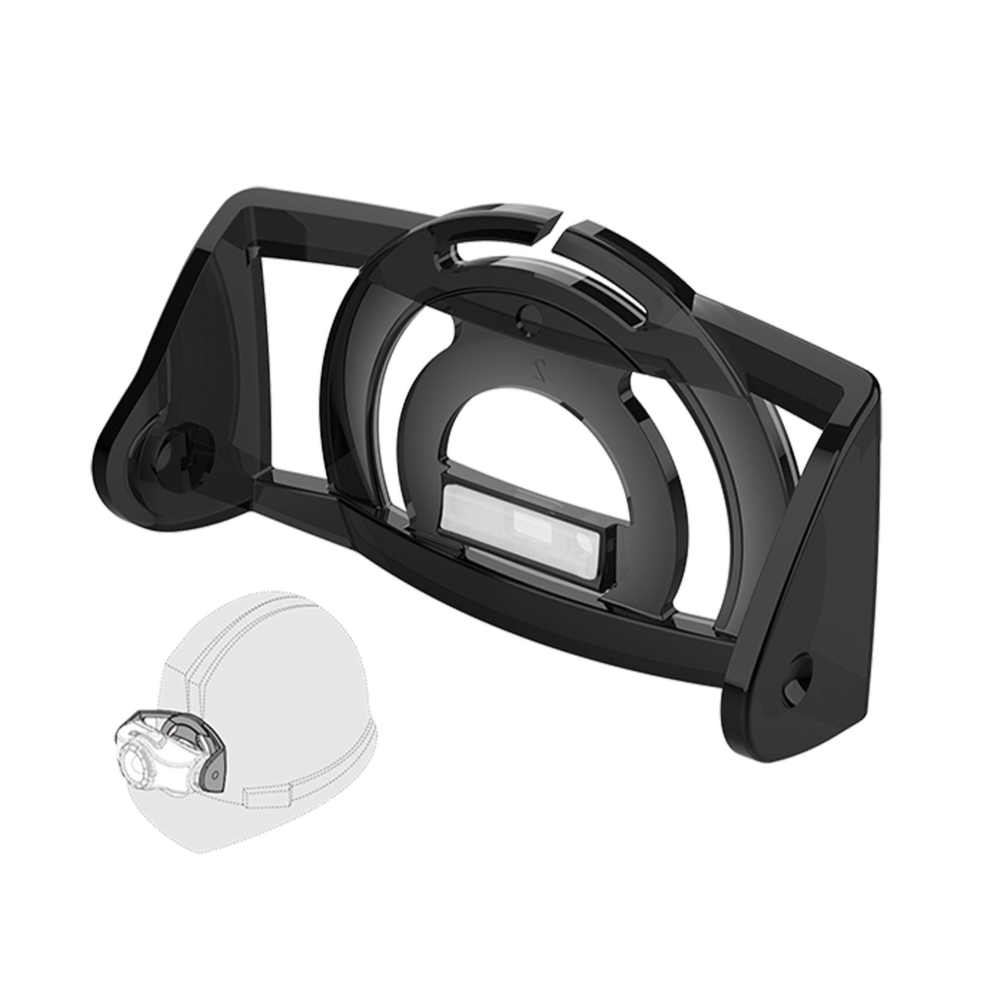 A simple helmet mount for frontal attachment of compatible head torches with use of the supplied adhesive pad.