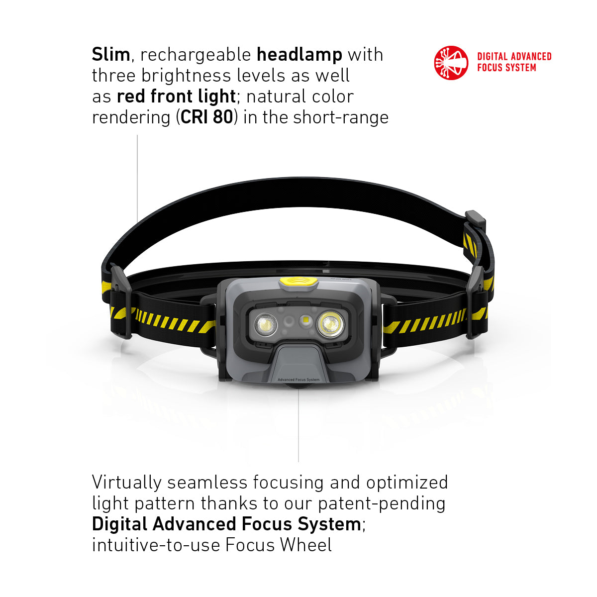 - Seamless spot / flood focusing thanks to the innovative patent pending Digital Advanced Focus System via rotary wheel