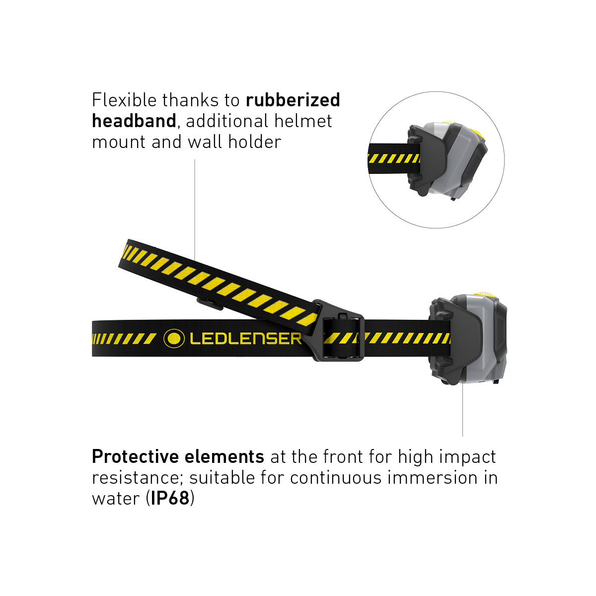 - Flexible use options thanks to rubberised headband, supplied helmet mount and wall holder