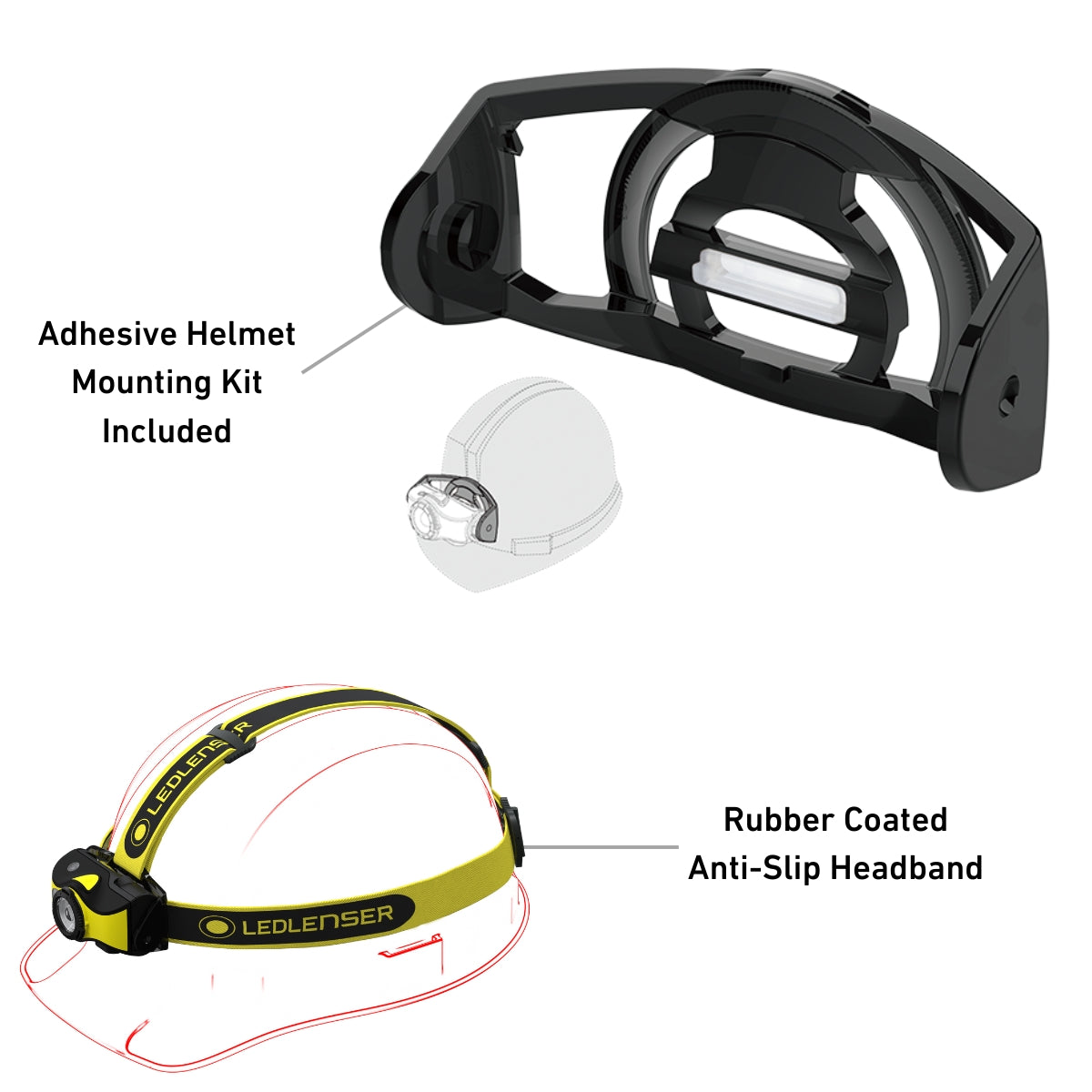- Hardhat mounting system allows for quick helmet attachment via either the rubber-coated headband or the adhesive hardhat mount