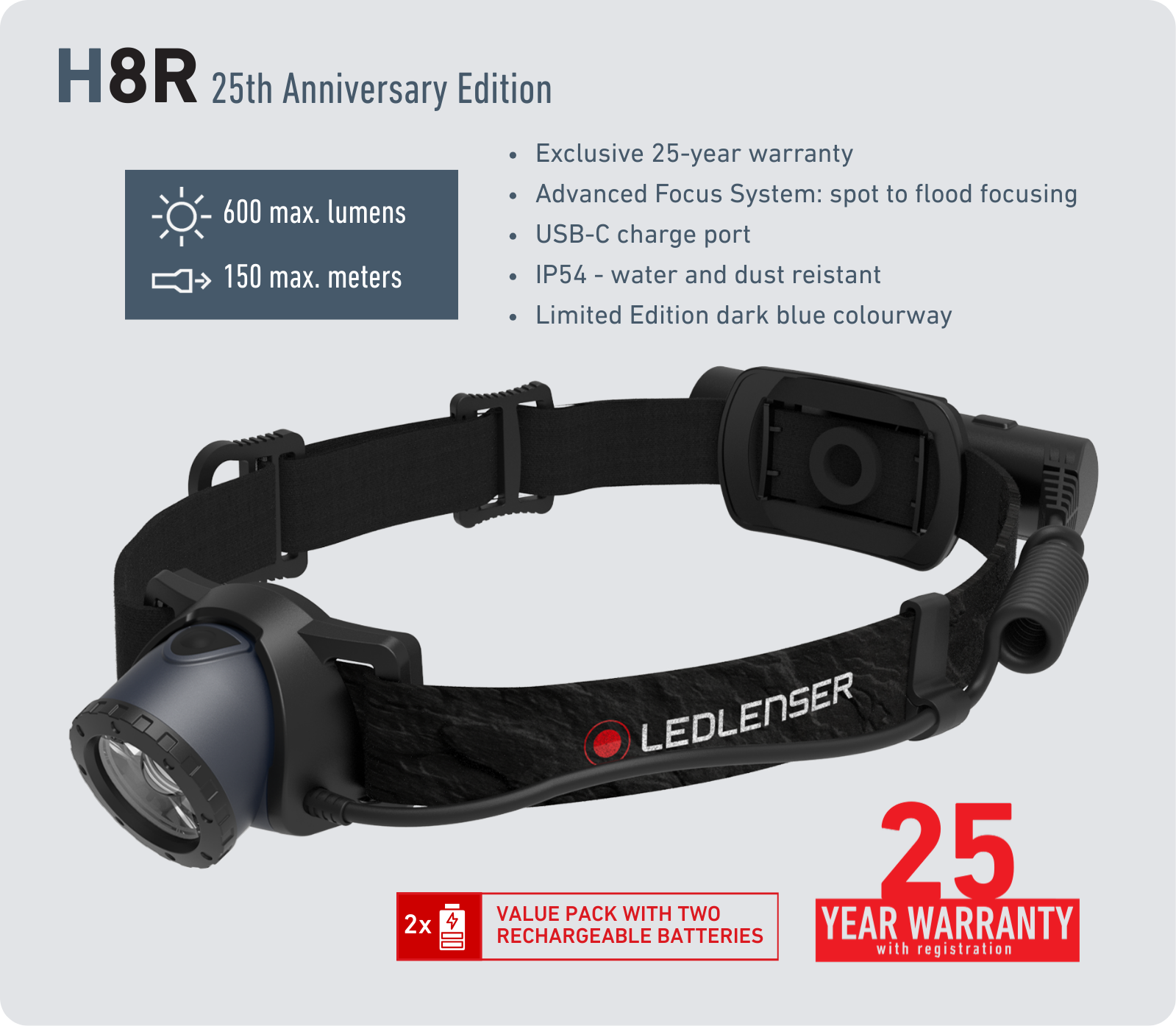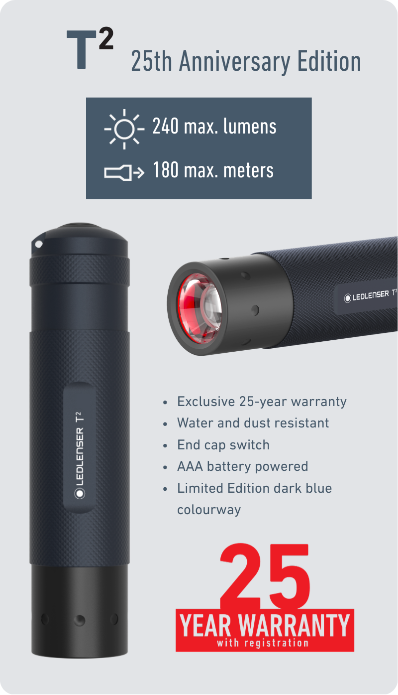 To celebrate 25 years of innovation, we have reimagined three iconic models, the P7R, H8R and T2, as limited 25th Anniversary Editions. Each includes an exclusive 25-year warranty, reflecting the durability, quality and reliability that define Ledlenser.
