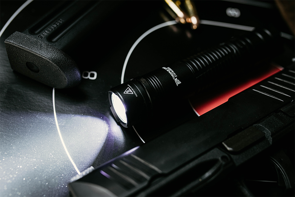 - Powerful yet compact tactical flashlight with optimised light pattern, three brightness modes and a strobe feature